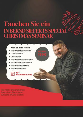 Am 16. November 2025 lädt Bernd Siefert zu seinem exklusiven Special Christmas Seminar ein – ein ganztägiges Erlebnis voller Genuss, Kreativität und festlicher Stimmung.