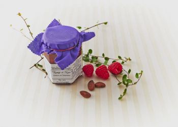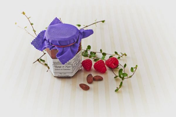 Zutaten: Himbeeren (mit Kernen), Kakaobohnenbruch, Zucker, Geliermittel Pektin, Säuerungsmittel: Zitronen- und Sorbinsäure